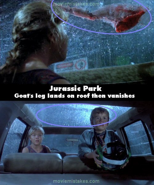 Continuity mistake: Just before the Tyrannosaurus Rex escapes from its pen, it drops a goat's leg on Lex and Timmy's car. When it comes back to attack them, the leg is gone. Then it appears and disappears. (01:00:25)