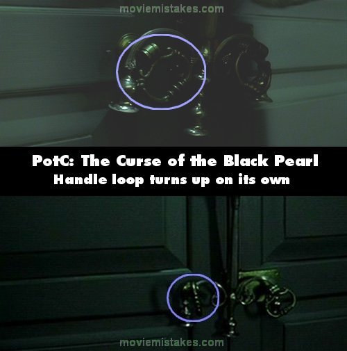 Continuity mistake: When Elizabeth puts the silver candelabra upside down on the door handles, the left handle is hanging down. In the next shot, that door handle is sticking straight out. No one touched it. (00:33:20)