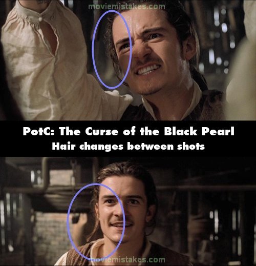 Continuity mistake: As Jack and Will are duelling while standing on the cart, and then up on the beams, in wide shots, Will's hair is pulled back perfectly in the ponytail, but in the close-up shots he has loose hair on the sides that is not held in the ponytail. This type of thing occurs numerous times in the film. (00:25:20)