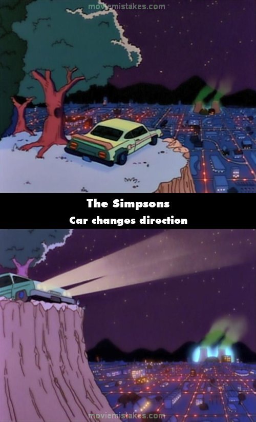 Continuity mistake: After Marge says she will marry Homer, at the beginning of the scene, the car is facing the power plant, and at the end, it is facing away from the plant. (00:07:45)