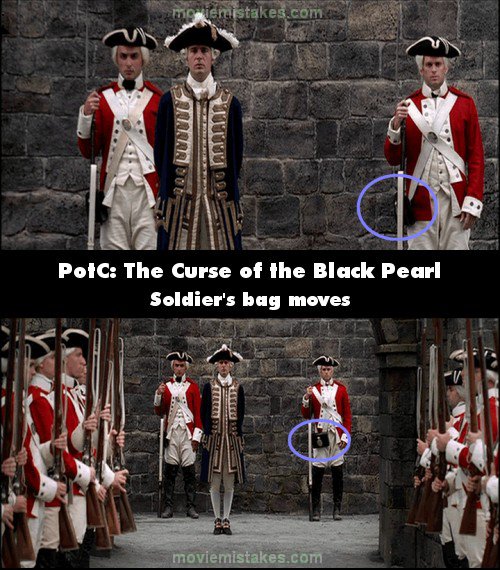 Continuity mistake: At the Fort, the two columns of soldiers separate and Norrington walks into view. It's shouted, "Right about face," and the soldier behind Norrington on his left has his black bag to his side. When "present arms" is shouted, the soldier's black bag is in front. Also, Governor Swann, in the front wide shot, is standing on the second step from the bottom. In the next close-up, he's standing on a step further up - the soldier to his left in the previous shot was standing on the same step as him. (00:11:15)