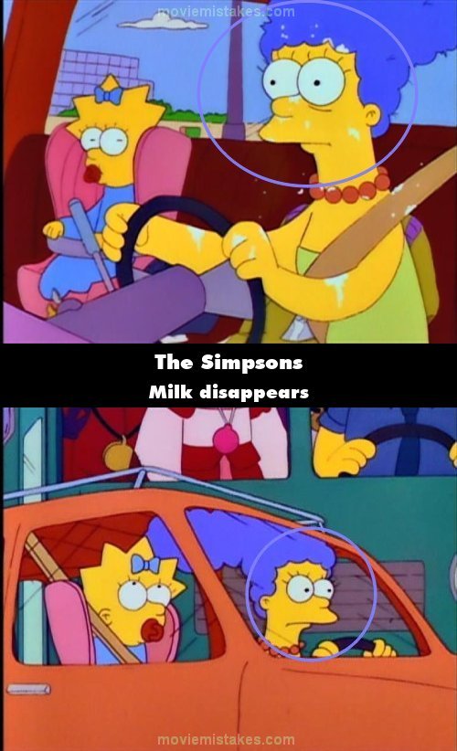 Continuity mistake: In the scene where Maggie rips of the top of her bottle, the milk spills everywhere, including on Marge's face. After this Marge goes really crazy and starts screaming. Right before she does this the milk on her face disappears. (00:04:50)
