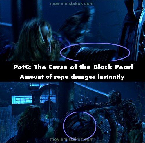 Continuity mistake: On the Black Pearl, just before Elizabeth spins the wheel on deck and knock's off Grapple's skeletal head, when she first approaches the wheel, it is fully wound up with rope. As she starts to spin the wheel, there are only about five lines of wound rope, next to the wheel. (00:59:25)
