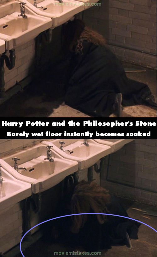Continuity mistake: During the scene with the troll, Hermione crawls over to where the sinks are and if you look at the floor you will see that there are only a few wet spots. In the very next shot, however, the whole floor is soaked (this occurs before the troll breaks all the sinks). (01:10:40)