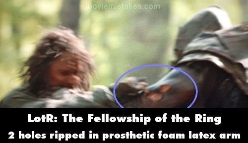 Revealing mistake: At the end of the film, there is a shot when Aragorn fights an Uruk-hai, just before Aragorn's back is up against the tree (before Legolas shoots six Uruks in a row). Look at the Uruk-hai's left arm, Aragorn rips two big holes with his fingers, in the Uruk-hai's skin. (01:21:20)
