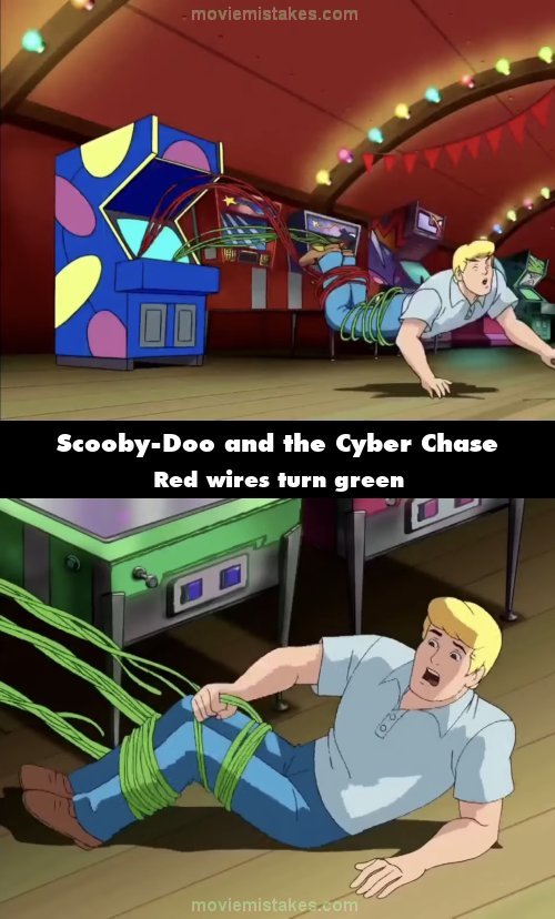 Continuity mistake: At the end level, when the gang are in the arcade, the phantom virus makes one of the videos games grab Fred. Some of the wires are red, but when the wires curl around Freds legs, they are all green.