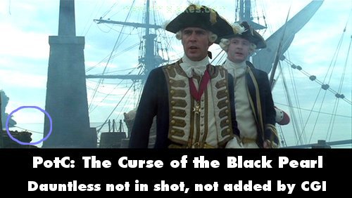 Revealing mistake: Norrington says, "Gillette, Mr. Sparrow has a dawn appointment with the gallows..." and he's standing at the dock. When he says the name Gillette, there is an unobstructed view. Behind Norrington to HIS right is the bottom part of the mountain's rocky cliffside and we do not see Dauntless moored. At this angle the Dauntless should be seen, though the digital editors neglected to add it. (00:20:30)