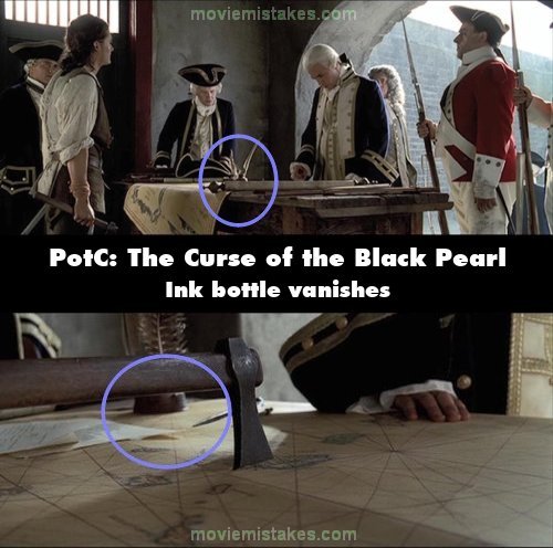Continuity mistake: Will goes to the fort and pleads with Norrington to find and save Elizabeth. On the table are two distinct feather quills. They're in different positions in the wide shot and in the close-up when Will slams the axe down on the map. Also, in that wide shot, there is a small bottle in front of the quill holder, whereas in the close-up, the small bottle isn't there. (00:41:40)