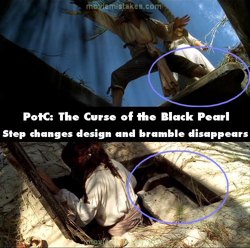 Continuity mistake: When Jack and Elizabeth are on the island Jack lifts the hatch to the underground cache of rum. In the first shot from below, the top stair is visible at the opening above. In the next shot from above the design/shape of the top stair is very different. Bramble disappears between shots as well. (01:36:00)