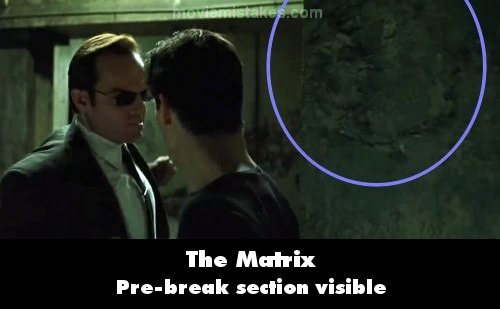 Revealing mistake: When Agent Smith is fighting with Neo in the subway, Neo's back is against a pillar. The area of the pillar which Agent Smith punches away with the first punch is visible before Neo ducks, and then he punches it away. You have to look carefully, because it only appears for a very short period of time. (01:50:35)
