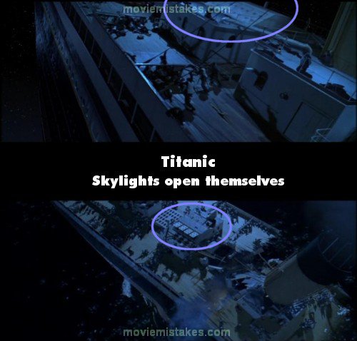 Continuity mistake: Right after the lights go out there is a structure directly aft of where the ship will break that on both sides of an angled roof have four panels, each with four portholes (a skylight). After the ship has broken apart and the smokestacks are falling off, it is now open. (02:40:55 - 02:41:50)