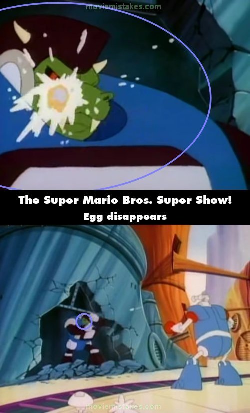 Continuity mistake: During the fight, the egg stains on Koopa either disappear or move around him. The stains eventually disappear entirely. (00:10:40)