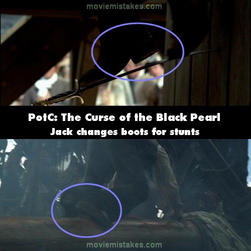 Deliberate mistake: Jack wears one pair of boots throughout the movie; however, the heel has at least two discernible heights, including the ones worn in the underwater close-up. One kind is worn by Tony Angelotti (Johnny Depp's stunt double) and the others are worn by Depp. When Jack steps onto the dock from the Jolly Mon and when he's balancing himself on Will's sword at the attempted hanging, he's wearing the higher heel boots. As Jack crawls across the broken mast chasing the monkey, and when he dives off the Pearl's plank, the lower heel boots are obvious. (01:34:40 - 02:06:30)