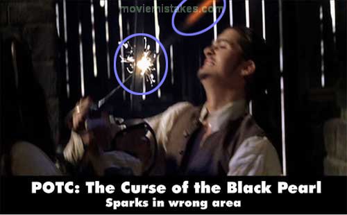 Revealing mistake: During the sword fight in the blacksmith's shop, Will pulls a blade out of the fire. While fighting Jack, the heated blade sparks when their two swords clash. When Will blocks a hit from Jack, the impact is far BELOW the red/orange hot section of Will's sword, yet it sparks right at that spot. It also makes a kind of sound like electricity crackling. A heated blade would not make this noise, nor would it send out embers or sparks where it is not heated. Only the tip is heated, however the whole blade has an electrical current running through it, mentioned in another mistake. (00:24:15)