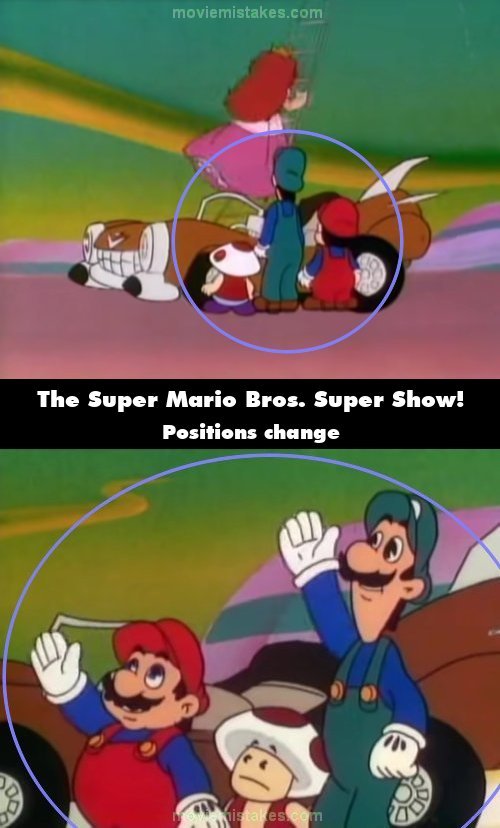 Continuity mistake: When Mario, Luigi and Toad say goodbye to the Princess, Toad is standing at the front of their car, Luigi in the middle, and Mario at the back. Two shots later, the order changes to Mario at the front, then Toad, and Luigi at the back of the car. (00:15:10)