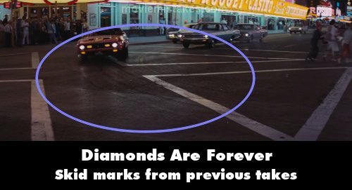 Revealing mistake: Many times throughout the car chase in Las Vegas between Bond and the cops, you can see skid marks where they tried earlier stunts with the cars on those points on the road. The most obvious is when Bond pulls away from the Sheriff after he approaches the car.