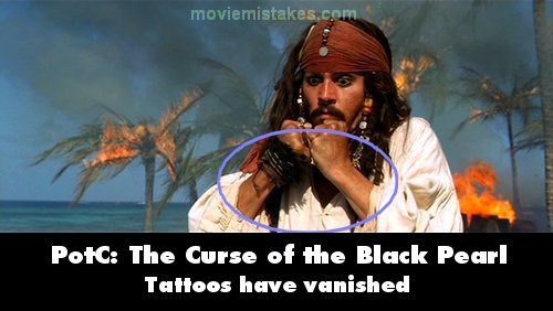 Revealing mistake: When Jack and Elizabeth are marooned on the island, Jack wants to know why the rum is gone. Elizabeth sits down in front of Jack, and as he stands behind her, he puts his fists up to his chin in frustration. His right forearm does not have the sun and sparrow tattoo showing, although part of it should be. The entire tattoo would not be hidden under his sleeve, makeup simply did not apply it for this shot. (01:39:20)
