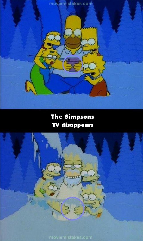Continuity mistake: At the end of 'The Shining, ' the family sits in the snow, Homer holding Willie's portable TV. Later, when they're frozen, Homer is holding nothing, although the TV's snow-topped antenna is still there. Additionally, Homer's left shoulder is missing. This is all due to the lack of correct colorization.