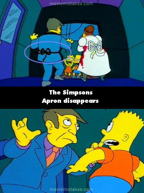 Continuity mistake: When Skinner is cooking the kids, he and the cook are chasing Bart, Lisa, and Milhouse. From the back, he has an apron tied around his neck. In the next shot, he puts on an apron.