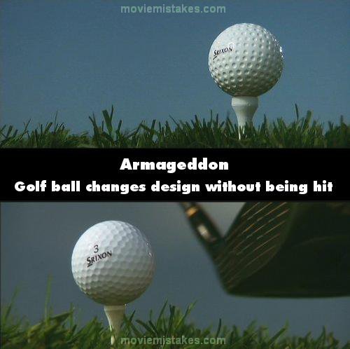 Continuity mistake: When Harry is golfing off of the oil rig, the holes on the golf ball are spaced about a yard away. In the next shot, before he hits it, the holes are right together. It also goes from saying just "Srixon" to "3 Srixon," then the lettering gets angled, then he finally hits it.