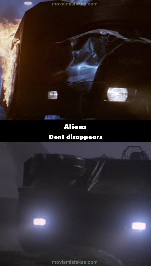 Continuity mistake: In the shot were Ripley is driving the crew away from the aliens, note the big dent in the vehicle. Then in another shot when they finally get outside, there's a shot from the side and the dent is gone. (01:19:15)