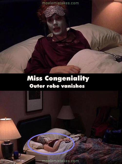 Continuity mistake: While Gracie and Cheryl are talking in Gracie's hotel room, the telephone on the nightstand between the two beds is on the right side of the lamp, and Miss Texas is lying down with the burgundy robe over her matching nightgown. When Gracie gets into bed, in this shot the telephone is now on the left side of the lamp and Miss Texas doesn't have the robe on. (00:44:45)