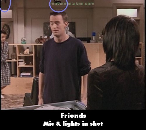 Visible crew/equipment: Just after Chandler says "I'm the smallest person in the world", and Joey comes out of his room, check the top left of the screen - you can see a boom mic track Matt LeBlanc across the set, and the bottom of some stage lights in the middle. (00:14:40)