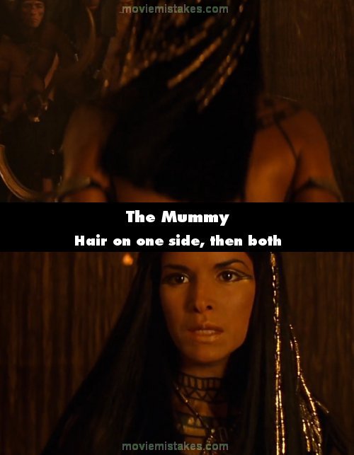 Continuity mistake: When they show Anck Su Namun committing suicide at the beginning, when the Pharaoh's guards show up she whips around to face them and all of her hair goes over her left shoulder. None is left on her right shoulder. However, in the shot from the front, she has half of her hair over each shoulder. (00:03:20)