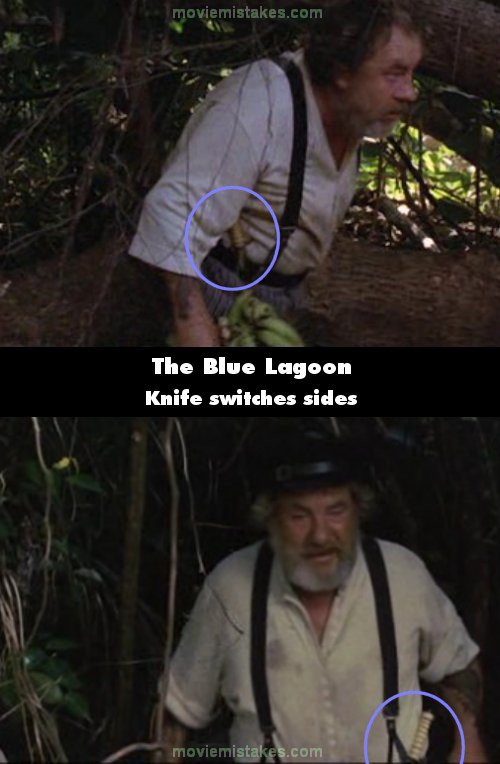 Continuity mistake: This mistake takes place when Paddy has grabbed some bananas and is walking through the jungle and stumbles upon God. In one shot as he's hoping over a log, his knife in his belt is on his right side. Soon after when he finds God, his knife in his belt is on his left side. (00:20:05)