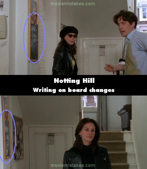 Continuity mistake: In the scene where Julia Robert's character first goes to Hugh Grant's character's flat, there's a chalkboard that's telling Spike to clean up. It's quite small writing, but in a close-up of Hugh Grant when he's directing her upstairs it's clearly larger. It then goes small again until she comes downstairs, when it goes large and stays that way. (00:12:10)