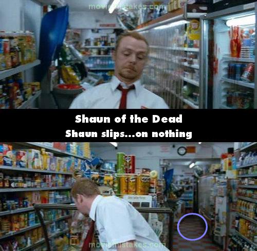 Continuity mistake: When Shaun goes to the newsagents after the dead rise, he gets a drink out of the fridge, which has blood-stained hand prints on. He slips on what we assume is blood as he walks away, yet on the way in and as he leaves the shop you can see behind him that there is no blood or any other liquid on the floor. (00:25:35)