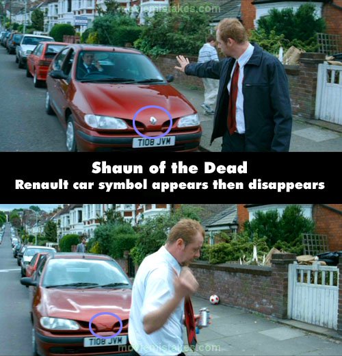 Continuity mistake: At the beginning of the film, when the camera pans across the road towards Shaun's house, the silver Renault badge on the hood of Pete's car is missing, but when Shaun goes to work that morning (Pete sits in the car), it's there. The badge disappears again later in the film. (00:06:55 - 00:24:25)