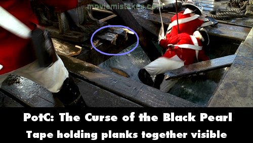 Visible crew/equipment: On the dock, when Jack grabs the rope, flies up and escapes, the cannon comes crashing down onto the dock. When the wood planks break (pre-cut wood), two Marines fall into the hole. Seen hanging under two of the remaining fixed wood planks are strips of tape that was used to help secure the pre-cut wood together with the fixed wood. Another view of this is also seen on DVD 2. (00:19:45)