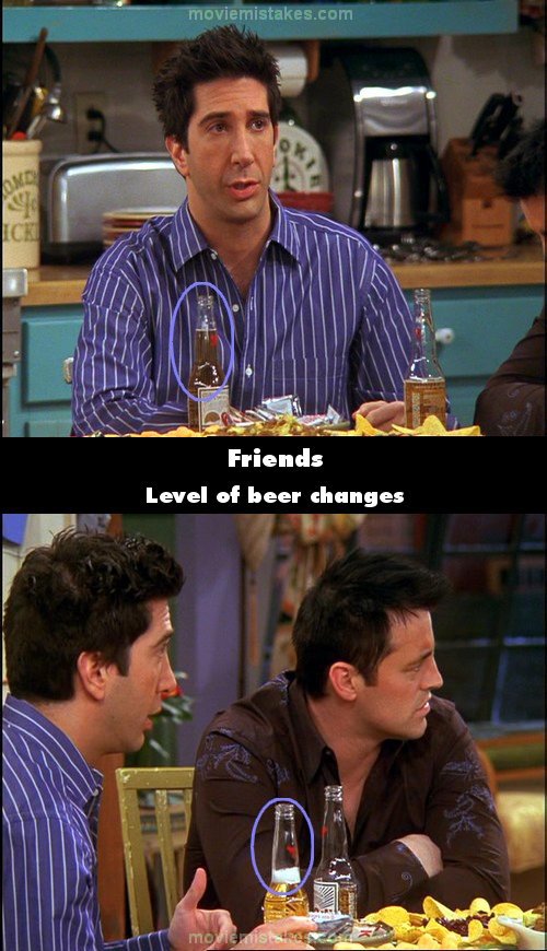 Continuity mistake: The level of beer in Ross' bottle goes up and down between shots as he's talking to Joey at the kitchen table. (00:12:00)