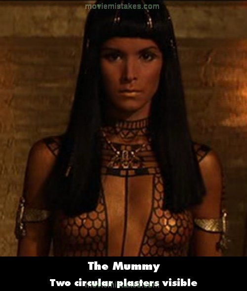 Revealing mistake: At the very start, as Anck Su Namun walks towards the camera, you can see two circular plasters underneath her body paint, preventing her from becoming too exposed. (00:01:20)