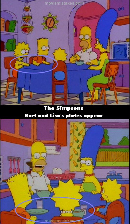 Continuity mistake: In 'The Thing and I' when Lisa and Bart are questioning Homer about the 'thing' up in the attic at breakfast, Homer is the only one eating. But in the next shot you can see Lisa and Bart with breakfast too. (00:01:30)