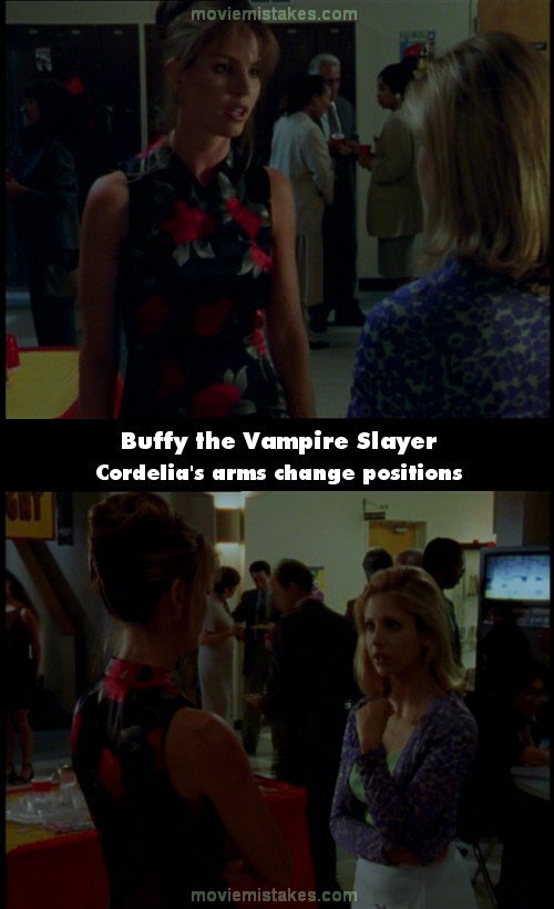 Continuity mistake: When Cordelia comes up to Buffy talking about how "even slaves get minimum wage", in pretty much every shot her arms switch from being at her sides to crossed in front of her, held behind her or on her hips.