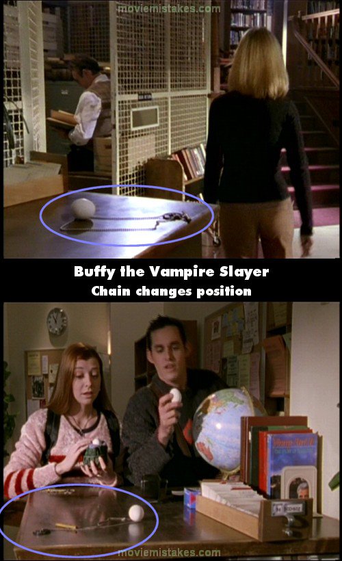 Continuity mistake: When Buffy puts her egg down, the position of the chain and pen she sets it down by change depending on whether the shot's from Willow's side or Buffy's. (00:08:40)