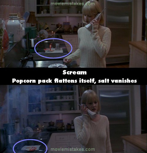Continuity mistake: When Casey is making popcorn, firstly the top of the popcorn that she tears off and places next to the stove changes from being folded in half, to later on laying down flat. Secondly Casey picks up a salt shaker and places it by the stove, but this later disappears. (00:01:25 - 00:03:30)