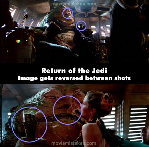 Continuity mistake: When Jabba pulls Leia's chain, there is a long shot as she leaps up onto his throne, and he is holding his wine goblet in his left hand, and pulling her chain with his right. However, in the very next shot (in which he says "Soon you will learn to appreciate me"), the entire frame is reversed. This is evident in Jabba's holding the wine in his "right" hand, his higher-placed nostril (which is normally on the left on his face) is now on the "right," Leia's reversal of her armlet, etc. (00:29:20)
