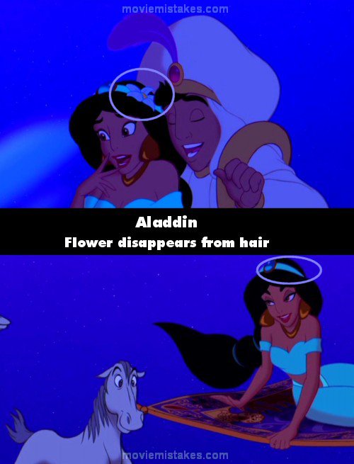 Continuity mistake: During the Magic Carpet Ride sequence, Jasmine's flower in her hair disappears when she pats the horse. Also, the horses are ridiculously small compared to Jasmine.