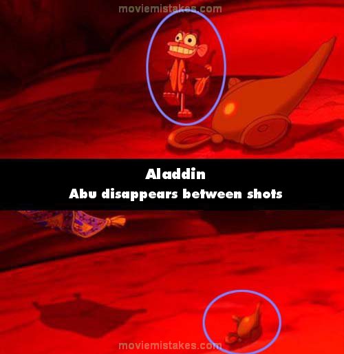 Continuity mistake: Aladdin, Magic Carpet and Abu have returned to the evil throne room. Aladdin tries to grab the lamp, but is unsuccessful. Abu runs for it and is turned into a toy cymbal clanging monkey. Magic Carpet swoops down to grab the lamp a split second after Abu is transformed, yet Abu is nowhere in sight on the floor even though he was directly next to the lamp clanging his cymbals. (01:15:00)