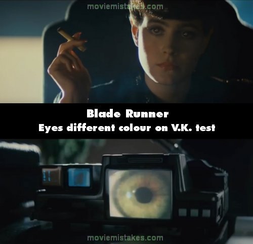 Continuity mistake: As Deckard is giving Rachel the V.K. test, it shows that her eyes are a shade of green. Her eyes are actually dark brown. (00:20:15)