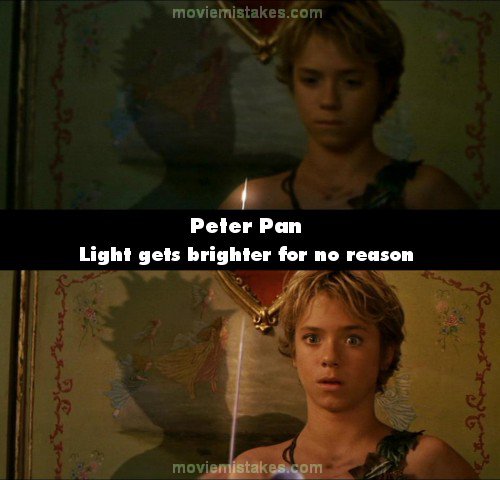 Continuity mistake: Wendy gets a needle and thread, then shows Peter the needle. As she says, "This may hurt a little," she shows the sharp needle to him. When she does the light in the room becomes brighter at this point (not a deliberate pun) as compared to the dimly lit nursery until this moment. It stays brightly lit until they leave for Neverland. (00:16:05)
