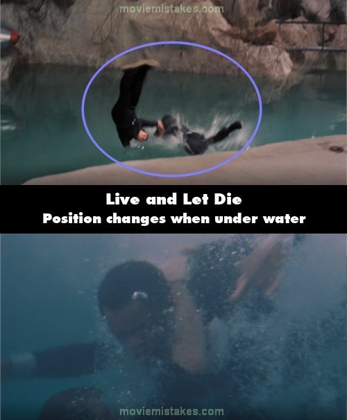 Continuity mistake: When Bond and Kanaga falls into the shark pool, they fall apart from each other. However, when we see them from under water, they are holding onto each other. (01:54:35)