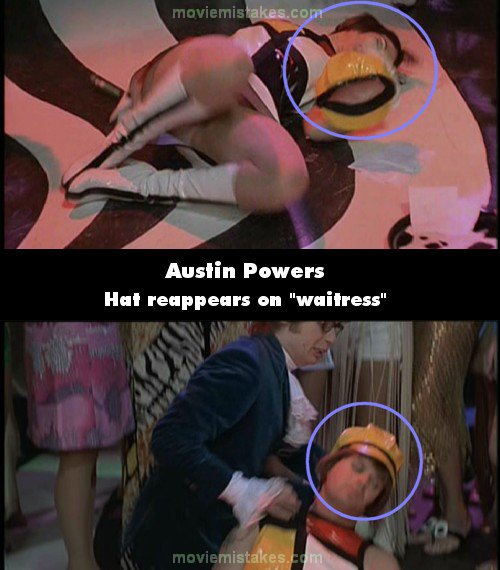 Continuity mistake: When Austin and Mrs. Kensington are at the Swinger's Club and the waitress gets punched in the face her hat falls off. In the next shot he/she is still wearing it. (00:05:10)