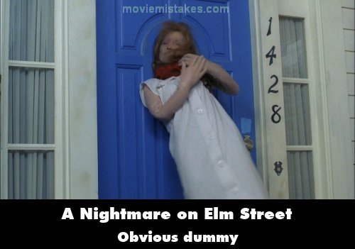 Visible crew/equipment: Right at the end of the film, when Nancy's mother is pulled through the front door window by Freddy, you can easily tell it's a dummy. (01:25:10)