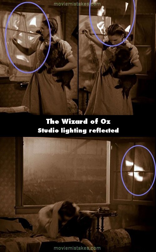 Visible crew/equipment: There are multiple fragmented reflections of studio lights on Dorothy's bedroom window, as it rips off due to the twister. (00:16:20)