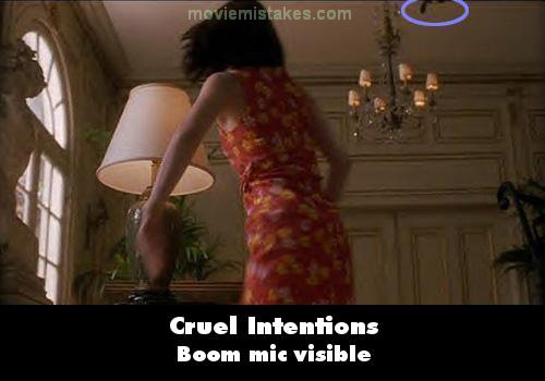 Visible crew/equipment: When Cecile sits with her Diet Coke on the floor, Kathryn knocks on the door, and Cecile gets up to open it. If you look by the chandelier you can clearly see the whole boom mic come down into the shot. (00:50:55)