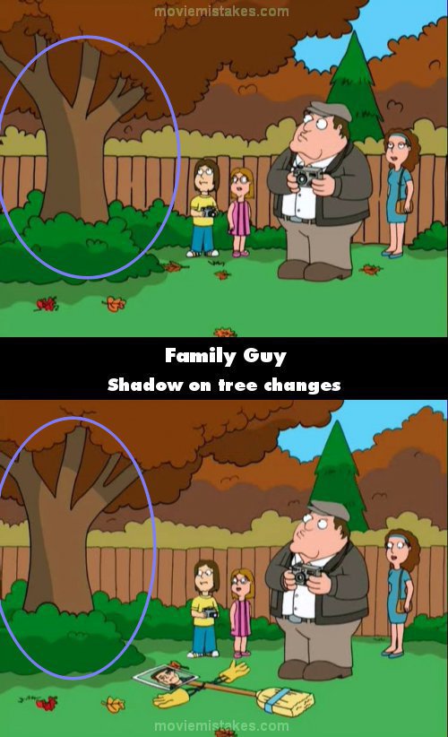 Continuity mistake: When Peter is pretending to be a man-eating tree, there is more of a shadow on the tree in the first shot than in the shot right after he spits out 'Dan Rather'. (00:05:50)